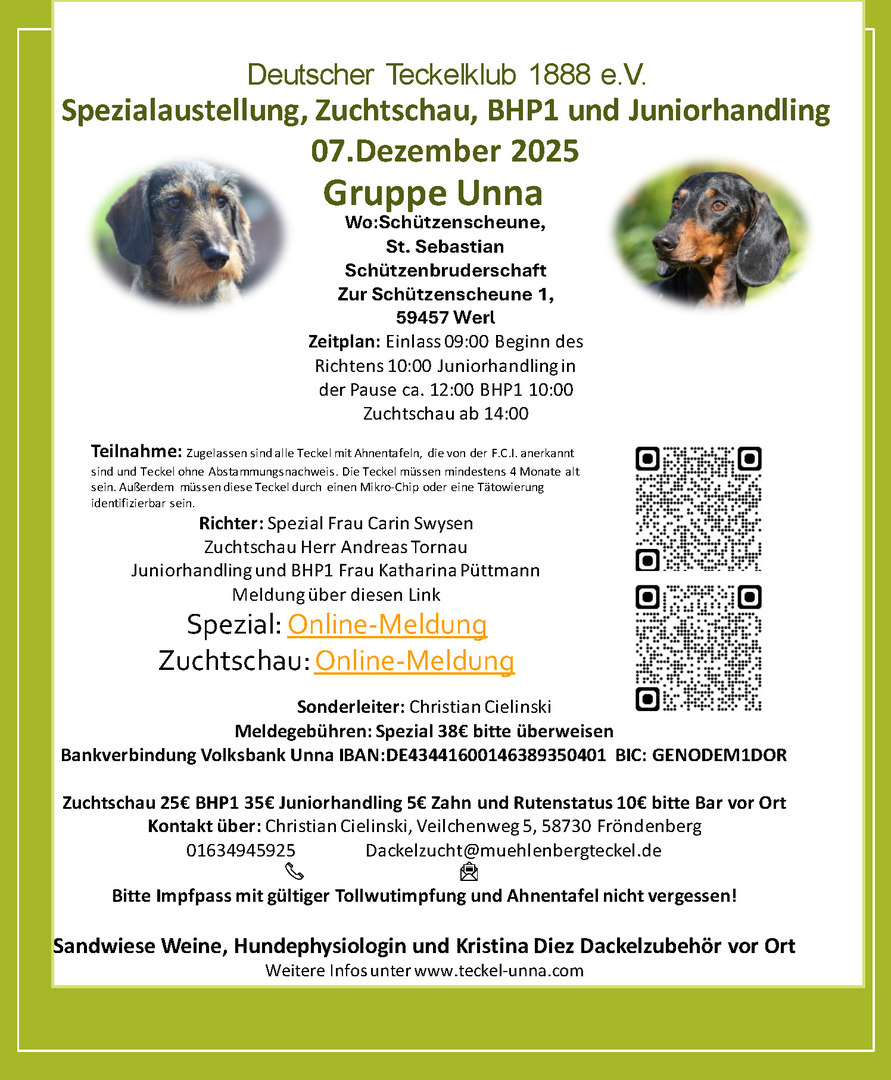Anmeldung bei Christian Cielinski, Mail: dackelzucht@muehlenbergteckel.